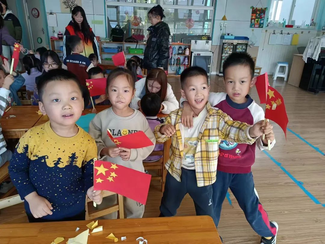 随后,志愿者与孩子们一起进行了手工活动,制作送给祖国妈妈的礼物——一面五星红旗。活动中,小朋友们小心翼翼地制作着他们的五星红旗。一根细细的旗杆,一面红红的旗子,五颗熠熠生辉的星星,简单的五星红旗,不简单的爱国心。最后孩子们挥舞着手中的红旗,与志愿者姐姐们,一起合照,定格下这红色的记忆。挥舞的红旗,跳动的爱国心。一抹抹中国红,在九百六十万平方公里的土地上,在祖国的大江南北,在小小幼儿园,在小朋友的手心里……
