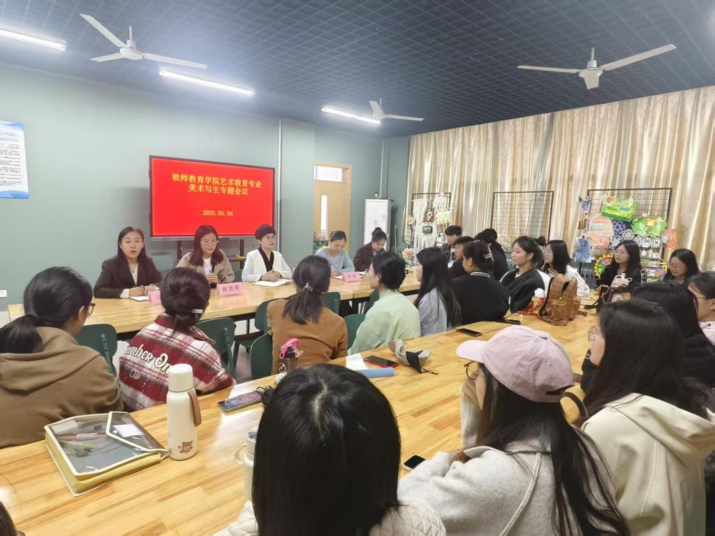 为提升艺术教育专业学生的实践能力,深化美术教育教学水平,教师教育学院于5月6日召开了艺术教育专业美术写生专题会议。教师教育学院院长唐艳平、副院长黄登翠、艺术教育系主任胡静、带队教师范晓霞、辅导员张译文出席会议,全体艺术教育专业学生参加。