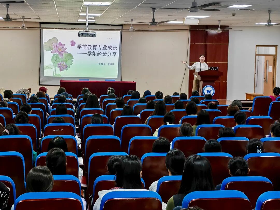 分享会上,朱孟晴首先从专业认知层面切入,结合个人学习经历,全面解析了学前教育专业的课程体系、能力要求及发展方向。她强调,理论与实践相结合是专业学习的核心要义,作为未来的幼儿教育工作者,不仅需要建立扎实的知识基础,更应涵养爱心、耐心与创新精神,以此践行“明德致知”的教育理念,实现立德树人的根本目标。在学业规划方面,朱孟晴着重分享了专业技能培养的有效路径。她指出,钢琴、美术、语言表达等实践技能是学前教育专业人才必备的职业素养,建议同学们尽早确立学习目标,制定系统训练计划,并积极参与技能竞赛、实习实训等实践活动。互动环节中,同学们围绕课程选修、实习准备与职业发展等议题踊跃提问,朱孟晴结合自身经验给予了细致解答。她勉励在场同学珍惜在校时光,以主动探索的精神拓展专业视野,以勇于实践的态度提升综合能力,在专业发展道路上实现持续成长。