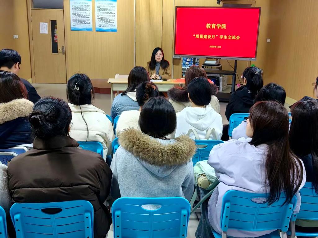 为实现以学生力量助推质量提升的核心目标,为学院质量建设月系列活动汇聚力量,近日,教育学院在学院224教室举行“质量建设月”学生交流会。会议由教育学院副院长黄登翠主持,全体学生会成员齐聚一堂。