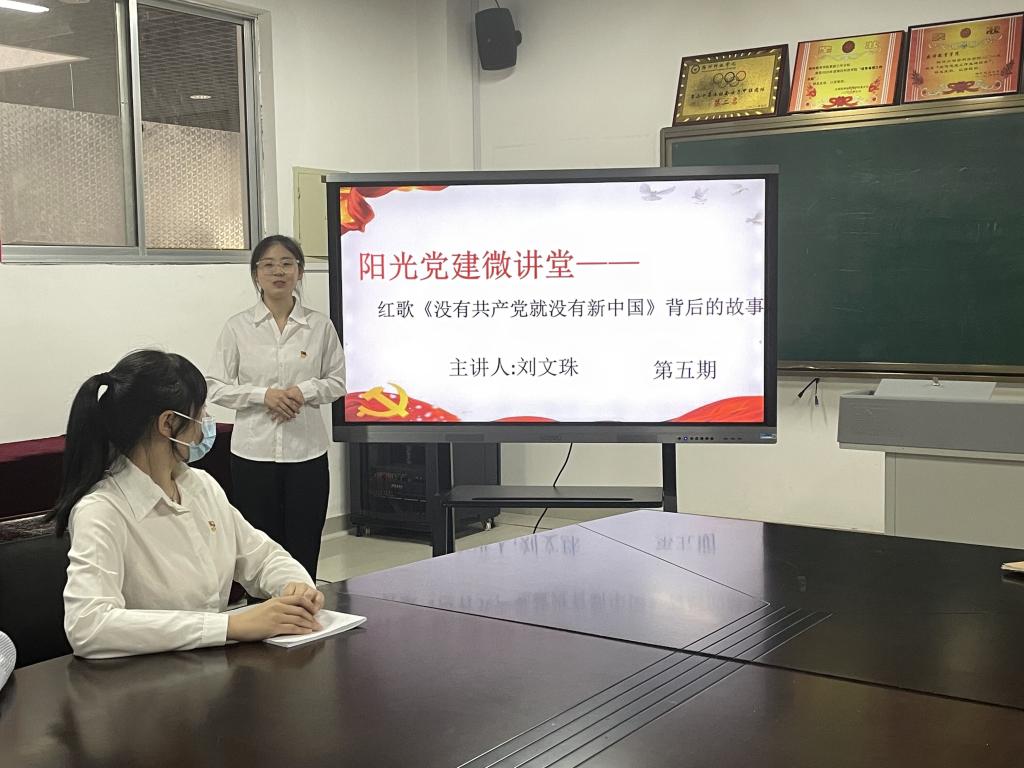 为了解红歌故事,传承红色精神。教师教育学院党支部在党员活动室举行了第五期阳光党建微讲堂,本期的主讲人是2021级学前教育专升本6班的学生党员刘文珠。